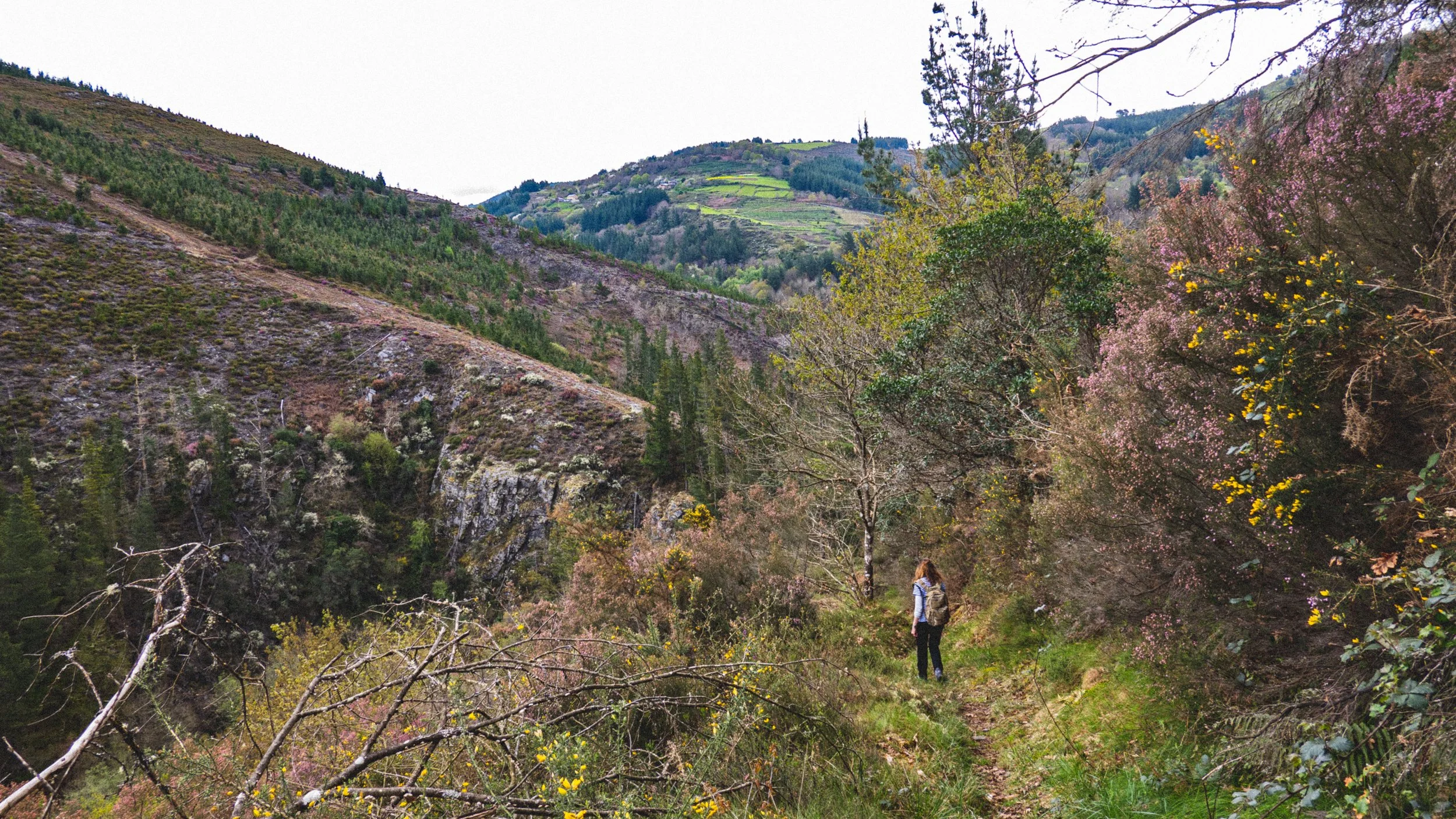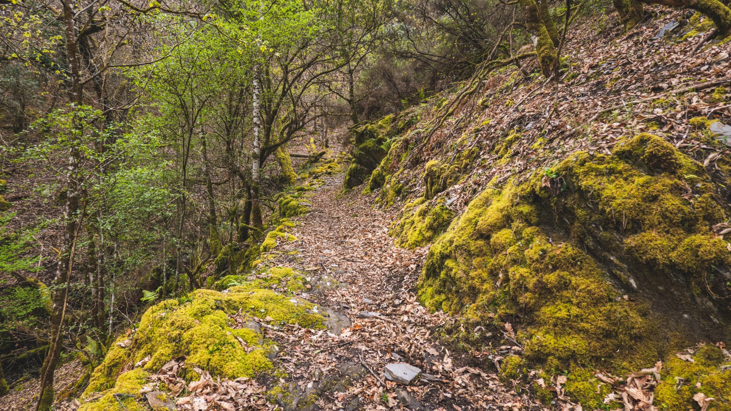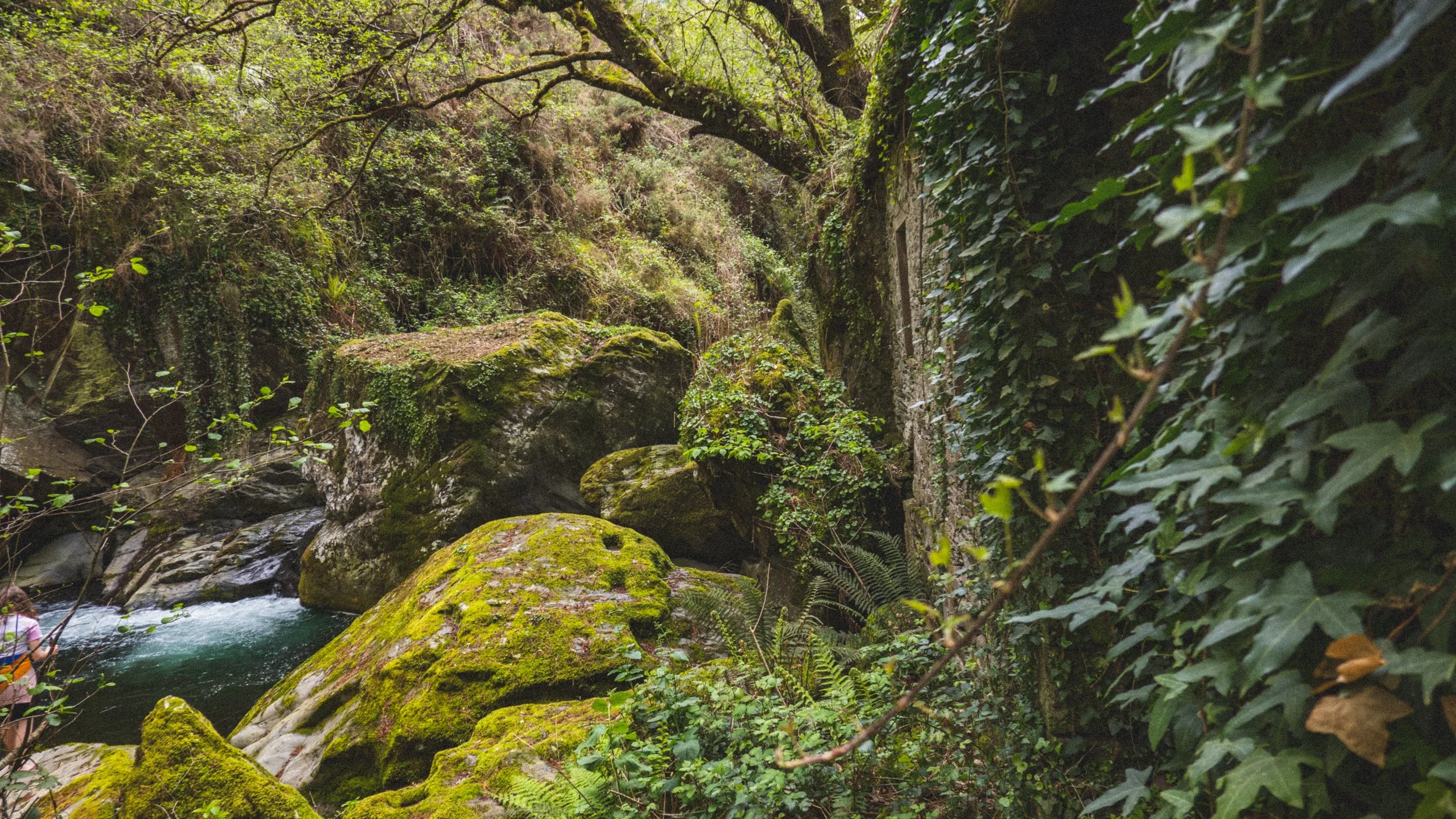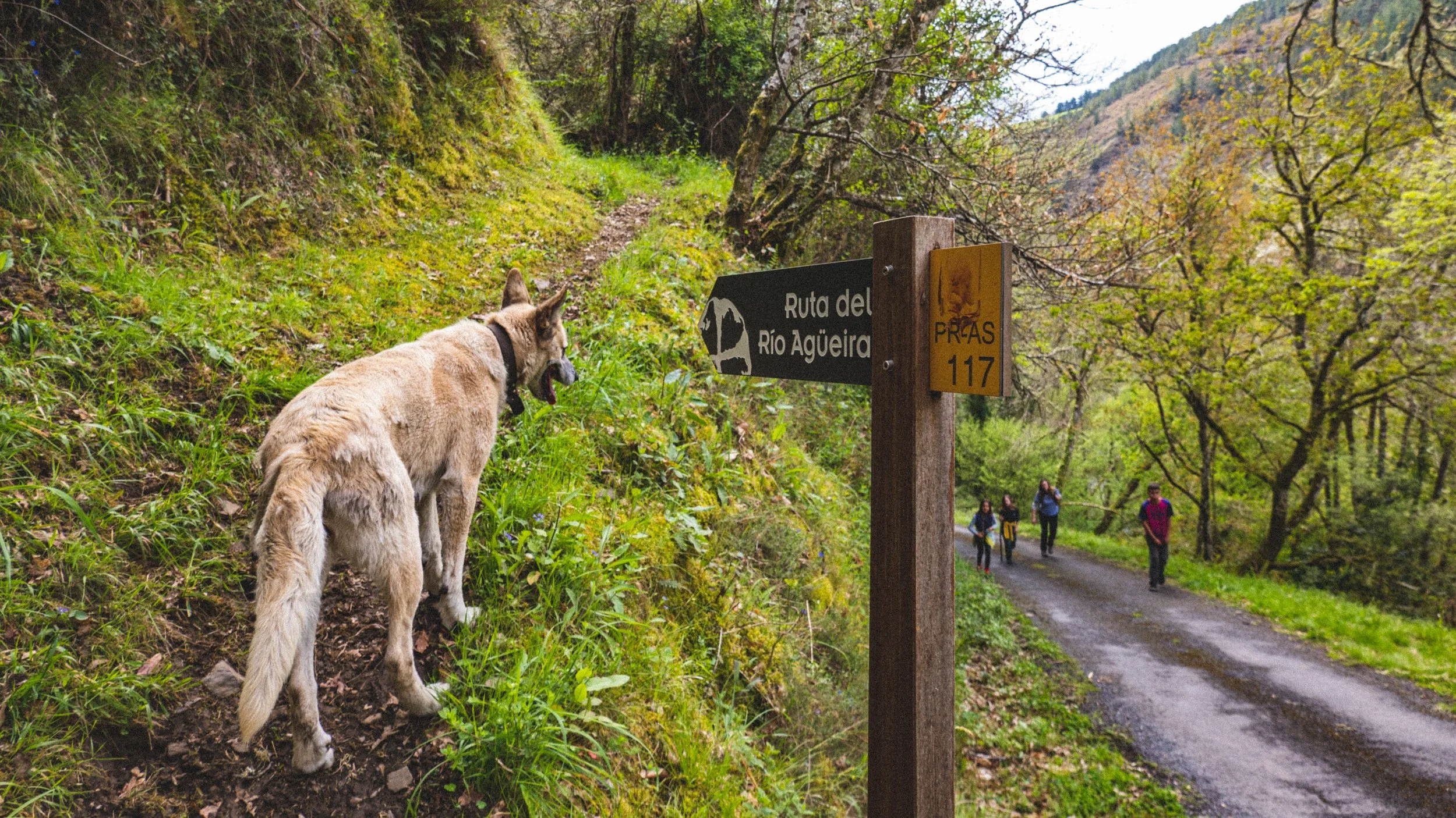 The first trail leads gently toward the stone village of Pesoz, slipping under a canopy of ancient chestnut and oak trees. The forest feels almost primeval — moss thick on the trunks, the air heavy with the scent of wet leaves and earth. Between the branches, you catch the soft murmur of the Río Agüeira, winding through ferns and fallen branches. Every bend holds a small discovery: a wooden bridge, an old mill half lost to time, or a ray of light piercing through the deep green.