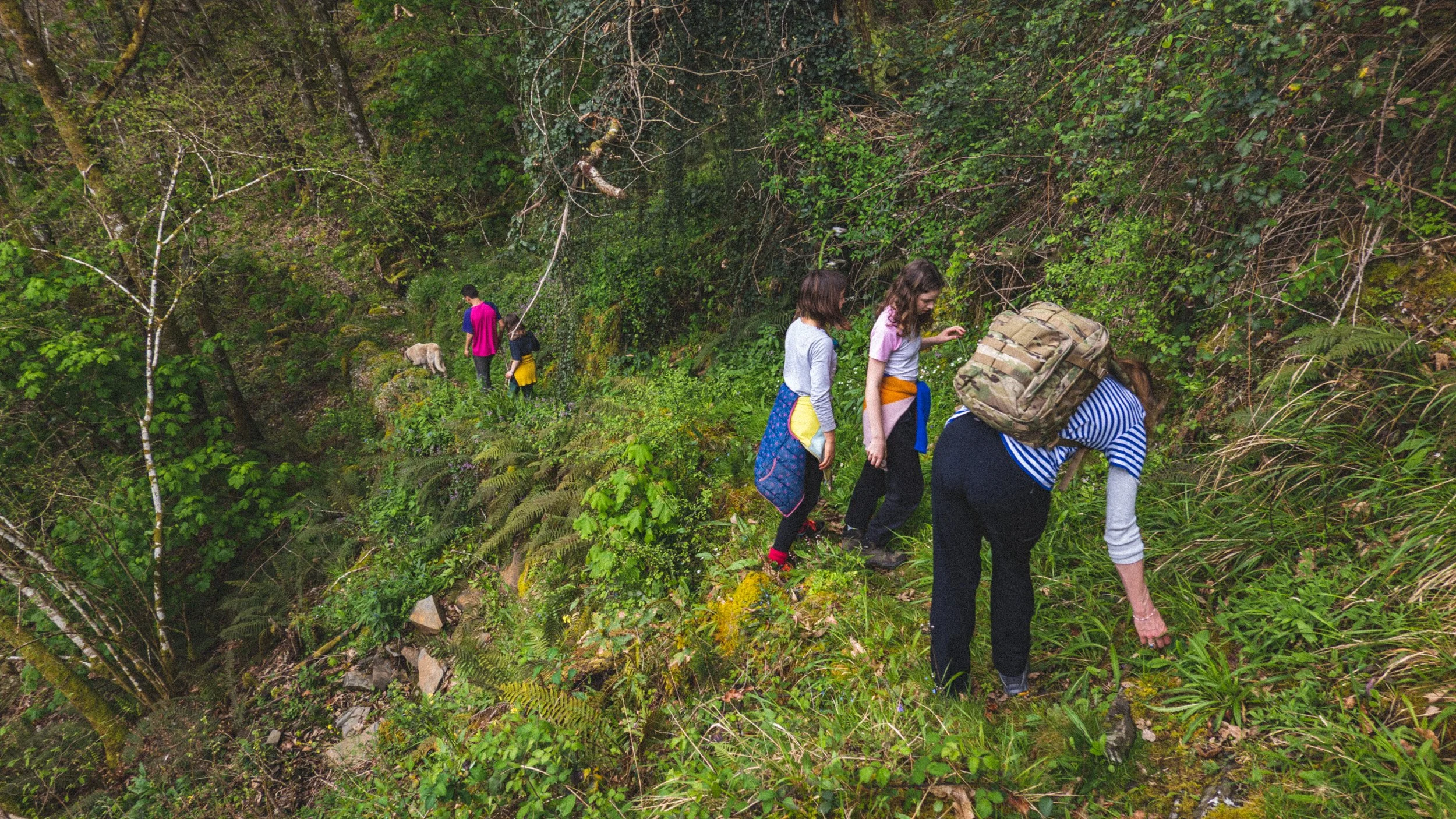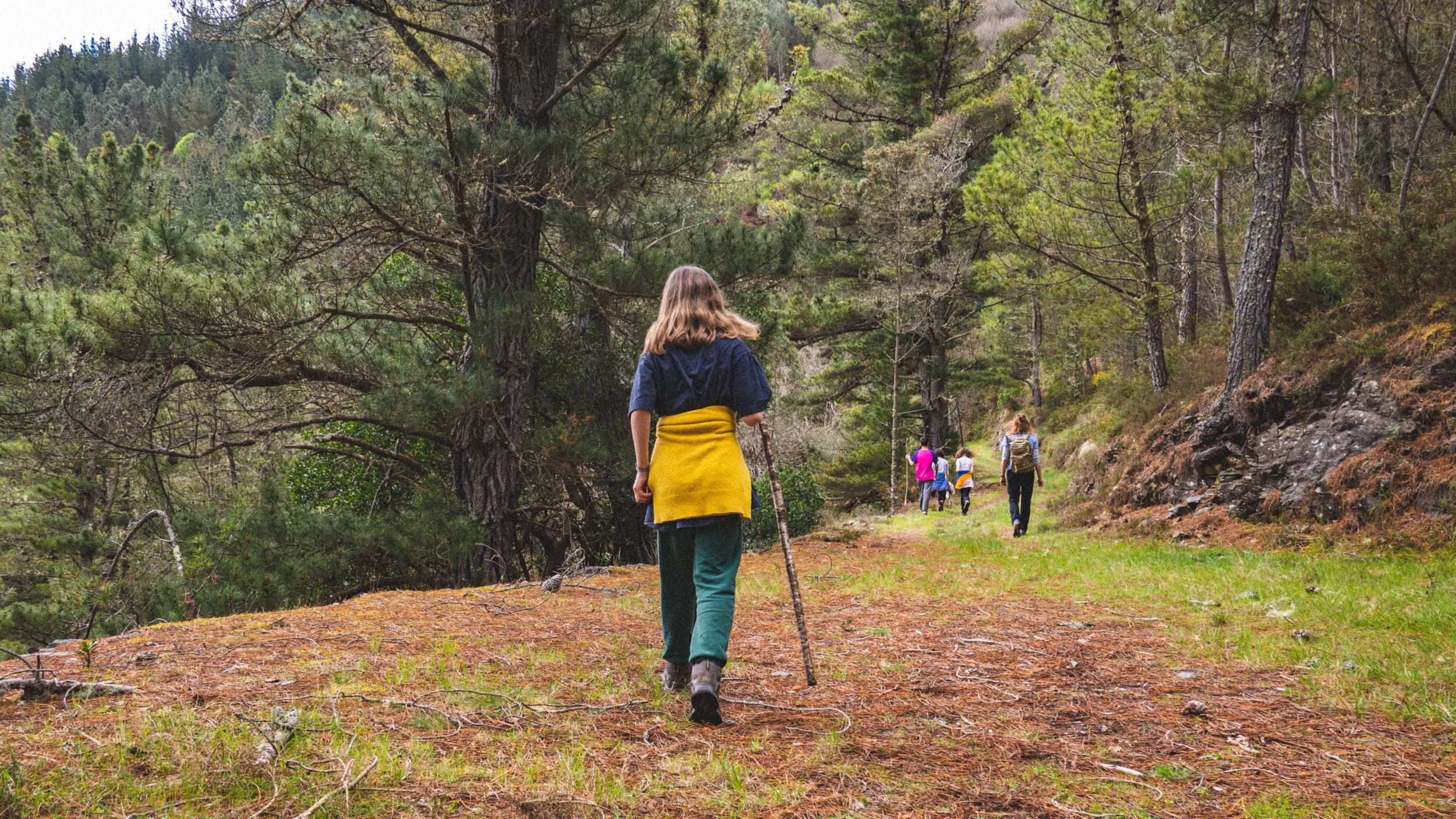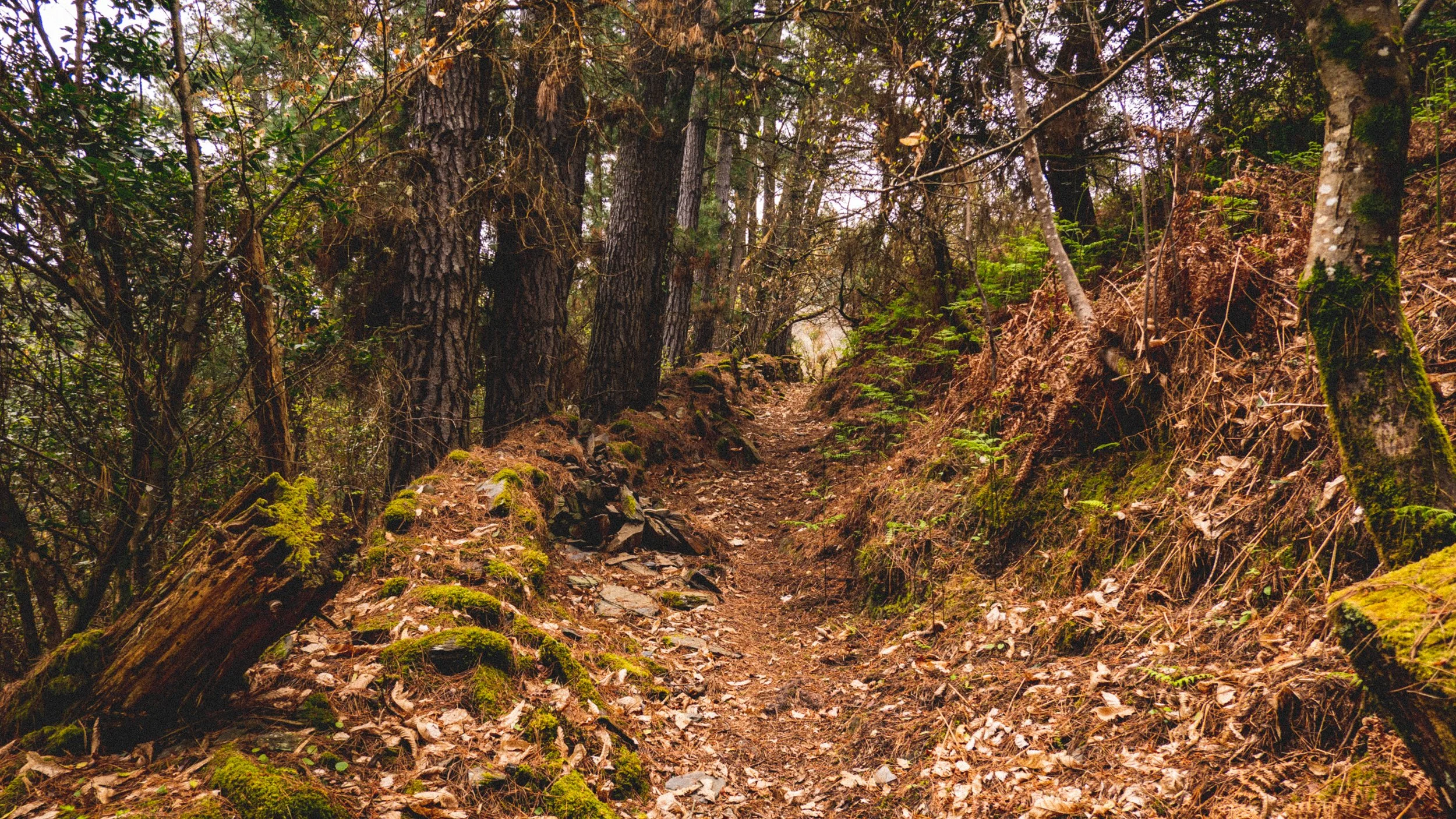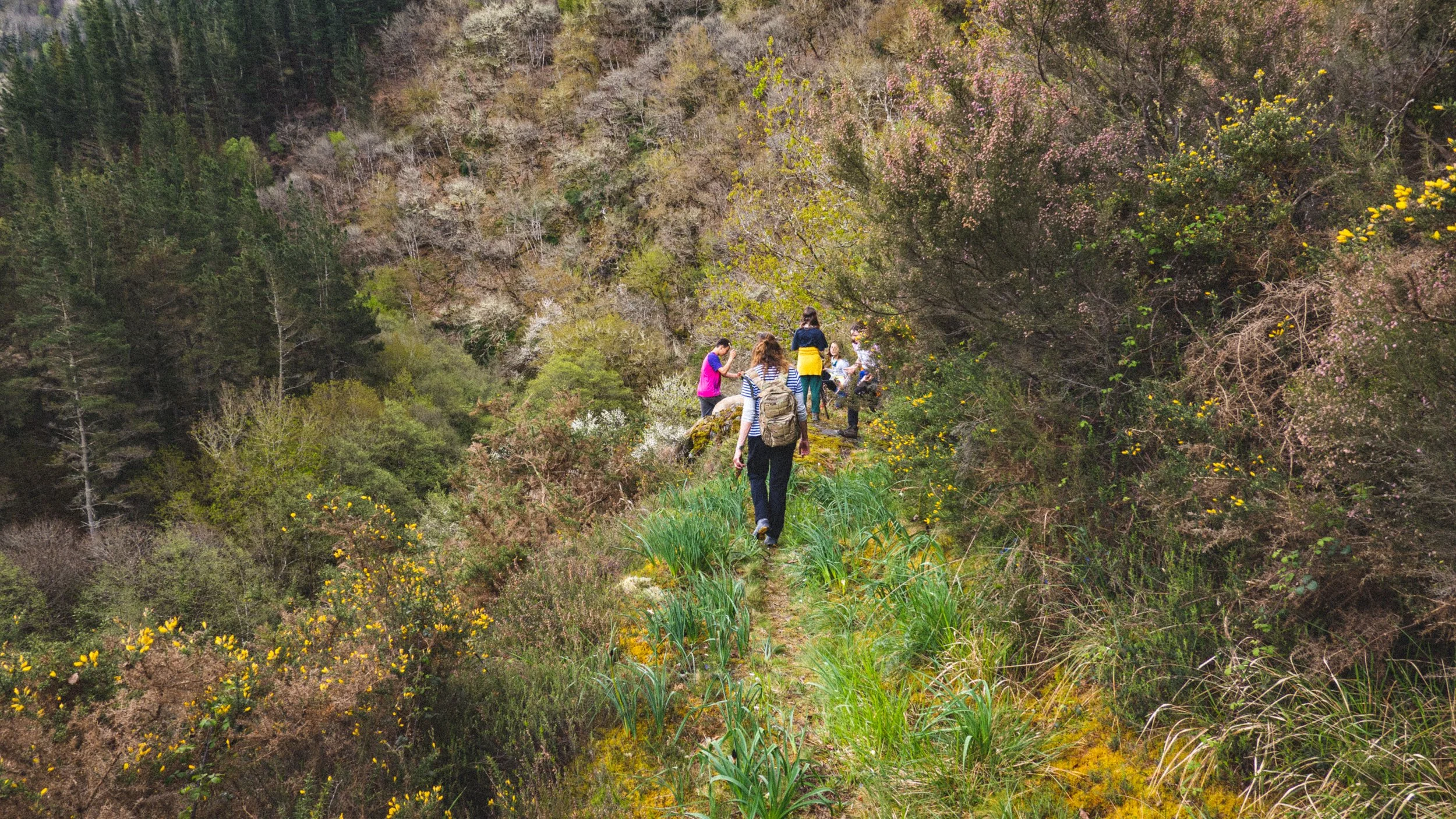 The second trail climbs the opposite way, up the mountain through groves and meadows toward a nearly abandoned hamlet and the Palacio del Mon. The higher you go, the wider the view — rolling ridges, misty valleys, and forests stretching endlessly across the horizon. Even though both routes follow the same tracks back, the return feels new each time — light shifts, colors change, and the forest reveals another side of its quiet beauty.