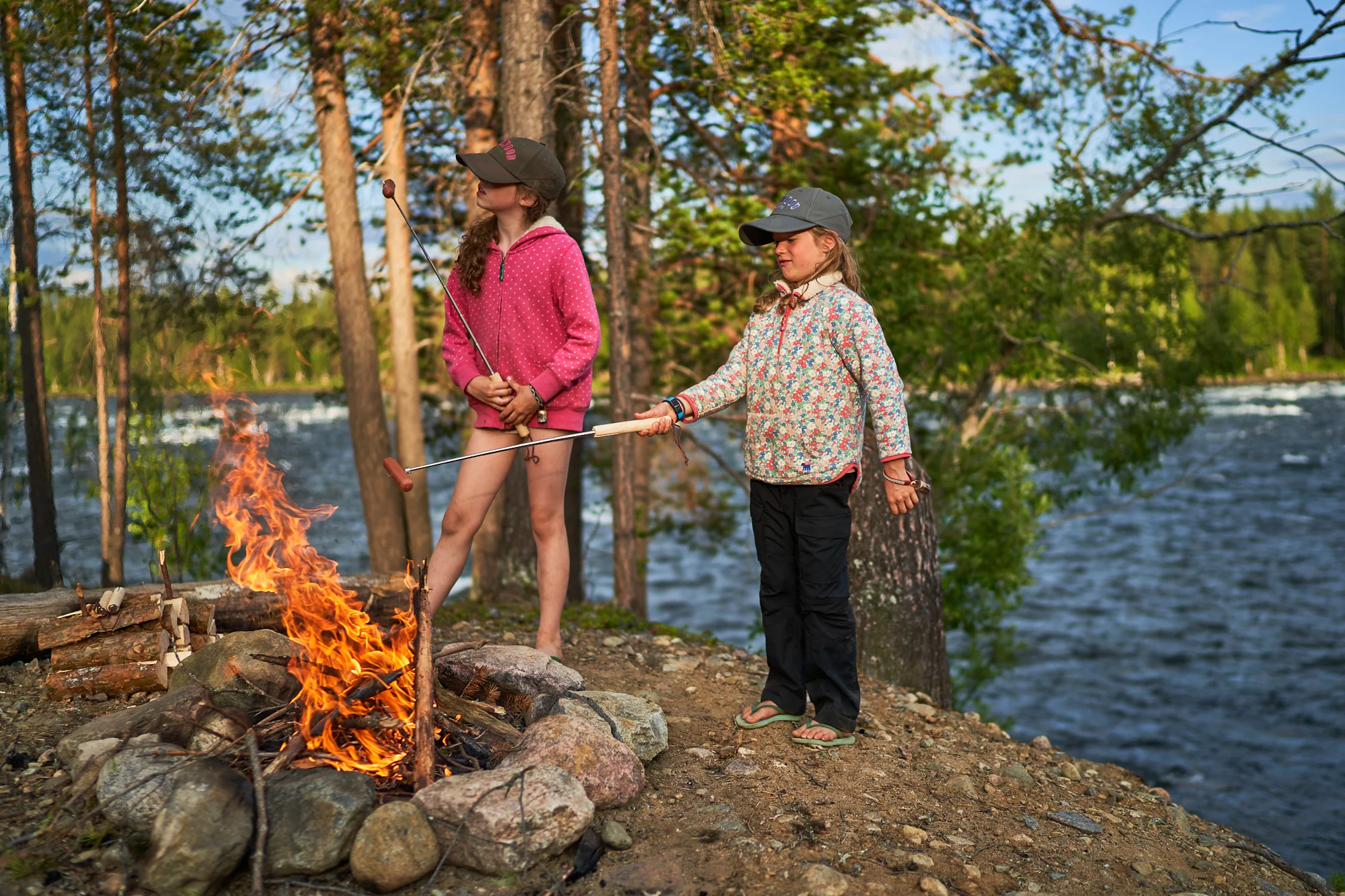 We built a fire from fallen pine logs, grilled sausages, and watched the smoke curl into the night. The river shimmered below us — silver and wild. The girls played until dusk, laughing, soaking wet and happy. It was the perfect place to end our adventure.