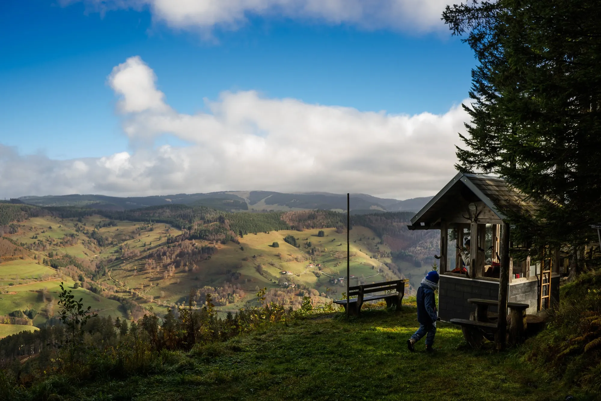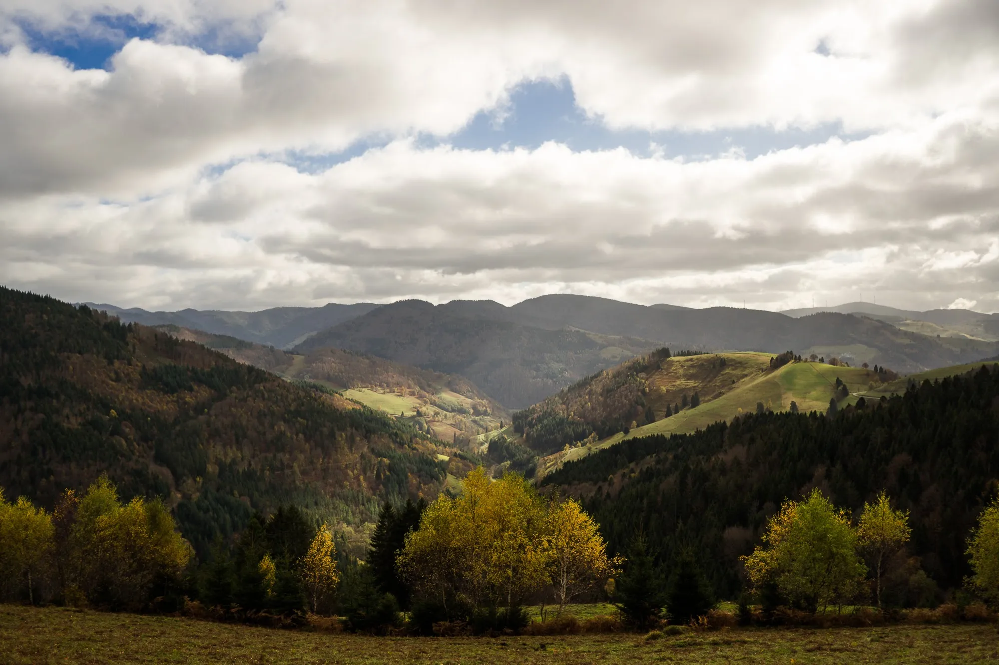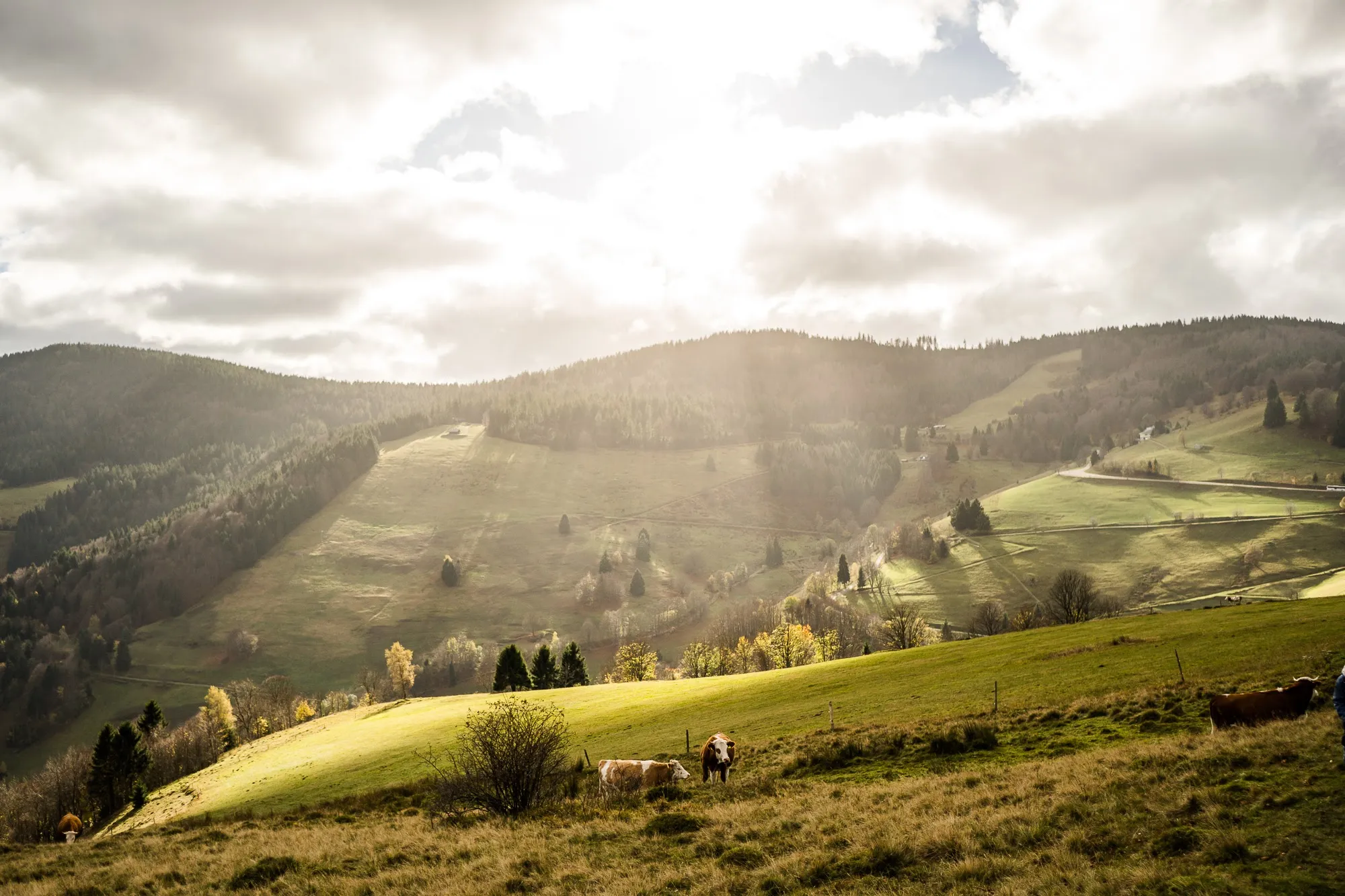 • The surroundings are typical Black Forest: dense spruce woods, rolling alpine meadows, old wooden farmhouses with deep roofs, and views that shift constantly between intimate and wide open.